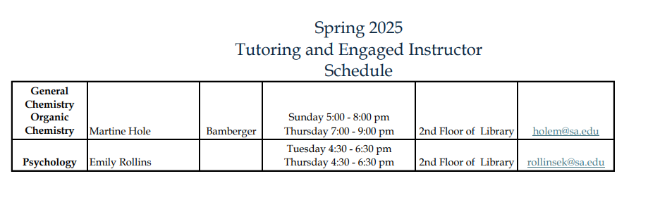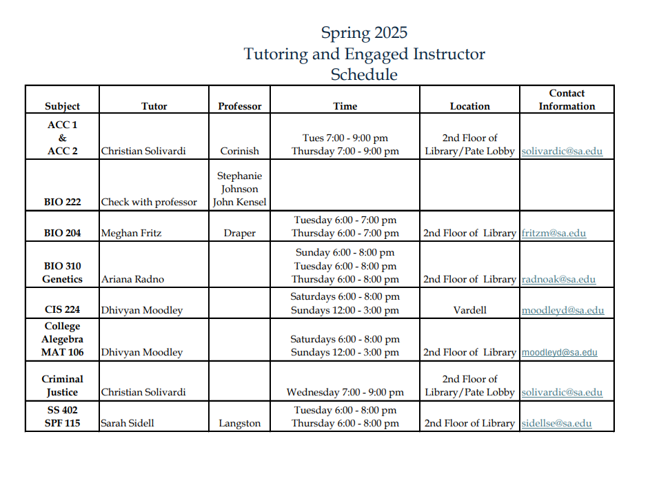 I hope that everyone is staying warm and taking care during this unusually long cold snap. As we enter our third week of the Spring 2025 semester, The Center for Academic Success is pleased to announce that tutors and engaged instructors are available to assist their peers. Please see the attached schedule. We are in the process of adding more tutors and will update the schedule as tutors are approved to work.